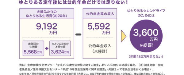 もっとゆとりのある老後にしたいのなら、毎月の生活費は約38万円必要(生命保険文化センター調べ)とも言われています。それだと約2,600万円不足分です。このデータを見てしまうと、老後資金はまだまだ先のこと、などとは言ってはいられません。何と言っても金額があまりに大きいのです、できるだけ若いうちから準備をしなければ間に合いません。退職金、企業年金だけでは心細いのが現実です。