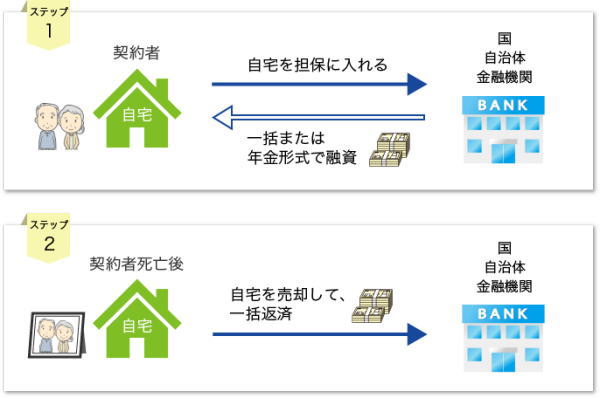 もう少し詳しく説明すれば、リバースモーゲージは、お金(年金形式あるいは利用限度枠内)を自由に引き出すことができる形式で融資を受けますが、自分か配偶者が亡くなった後から担保にした自宅を売却し、一括返済することになります。住み慣れた自宅を手放さずにお金を借りられるというメリットはかなり大きいでしょう。